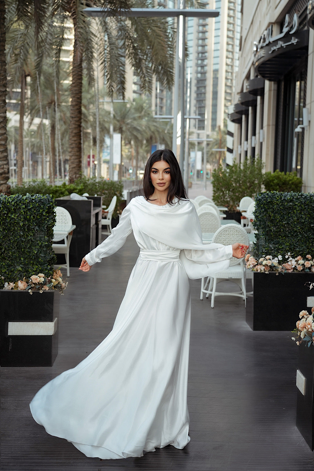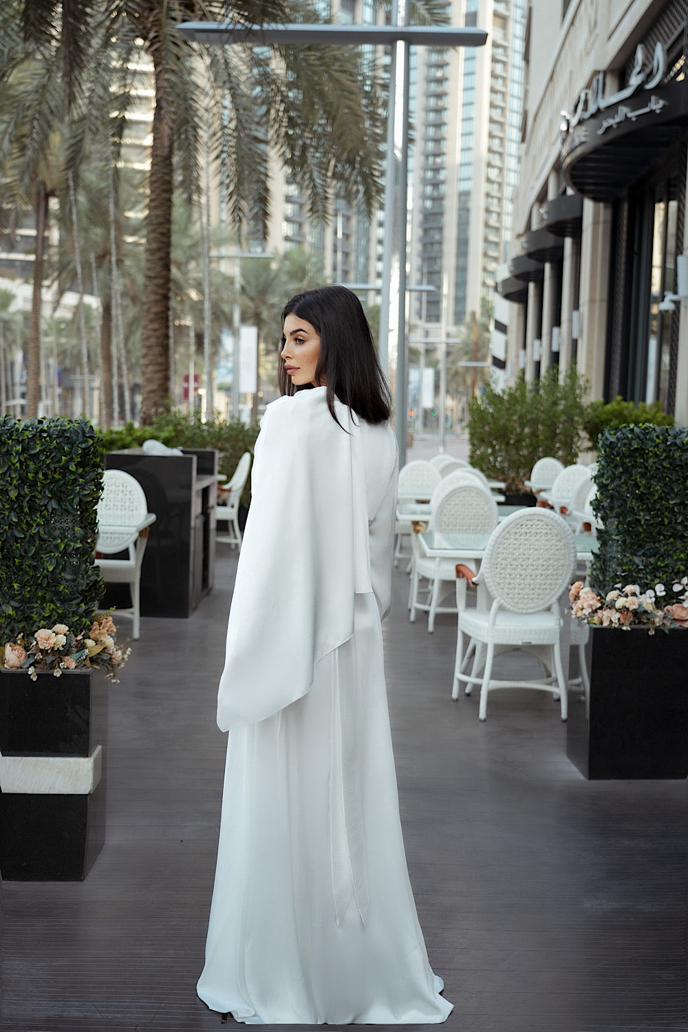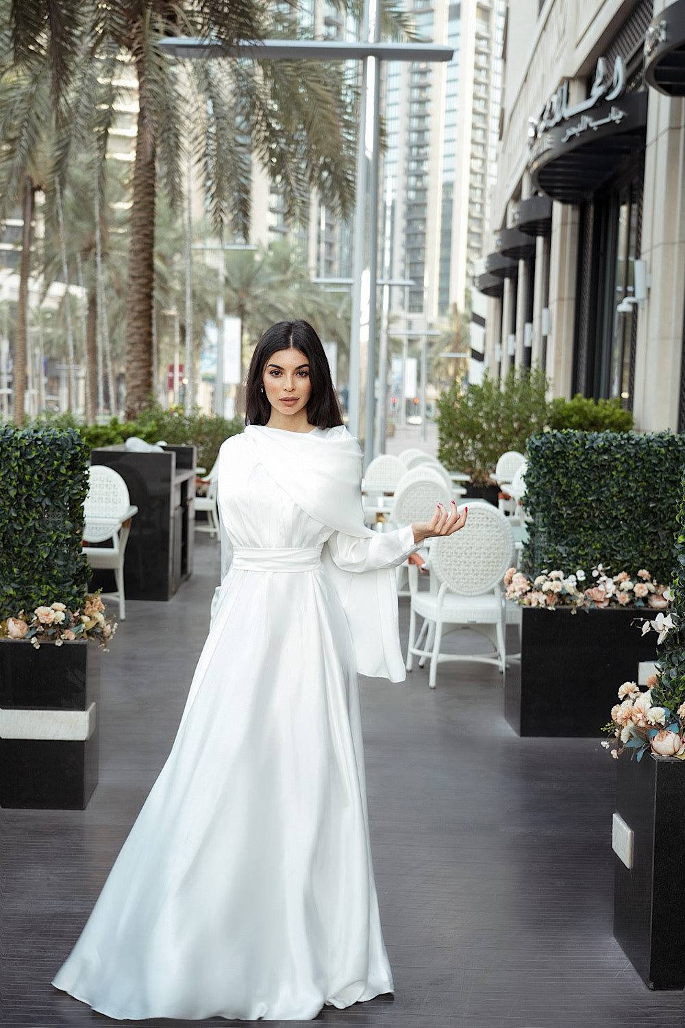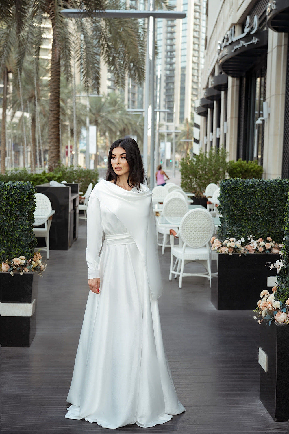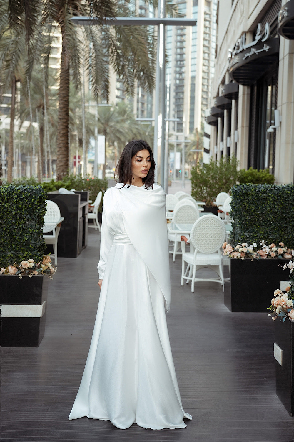 The head cover in matching colour is not part of the dress. It is accessory for the photoshoot. Only the head cover is not part of the dress - not the drapery. If you want to order such head cover - write us on WhatsApp. Price 40AED
