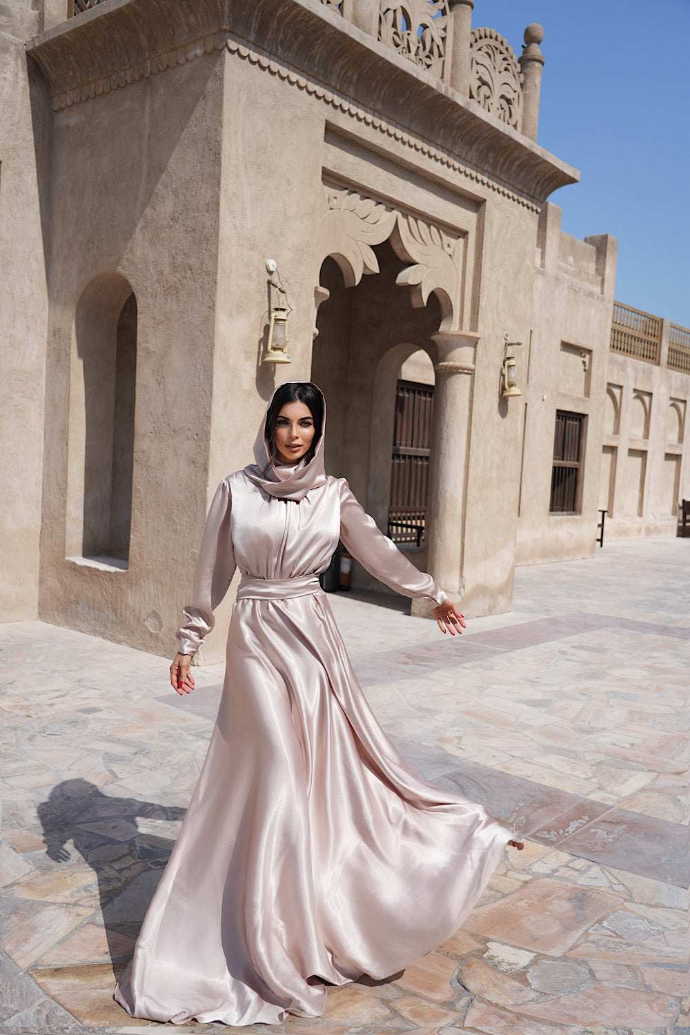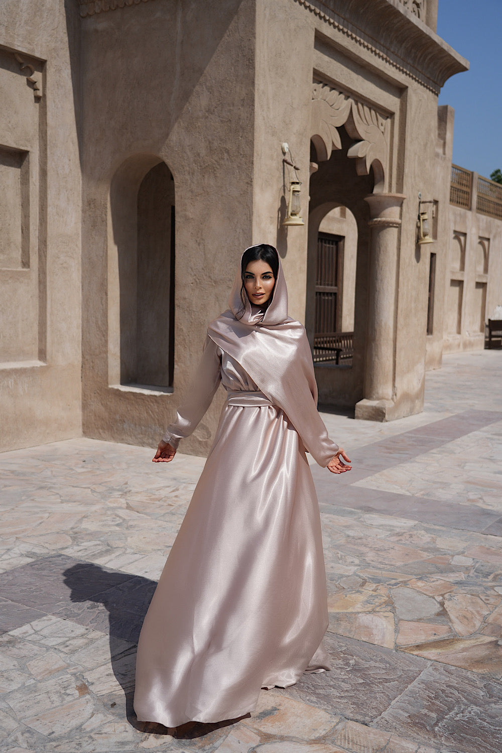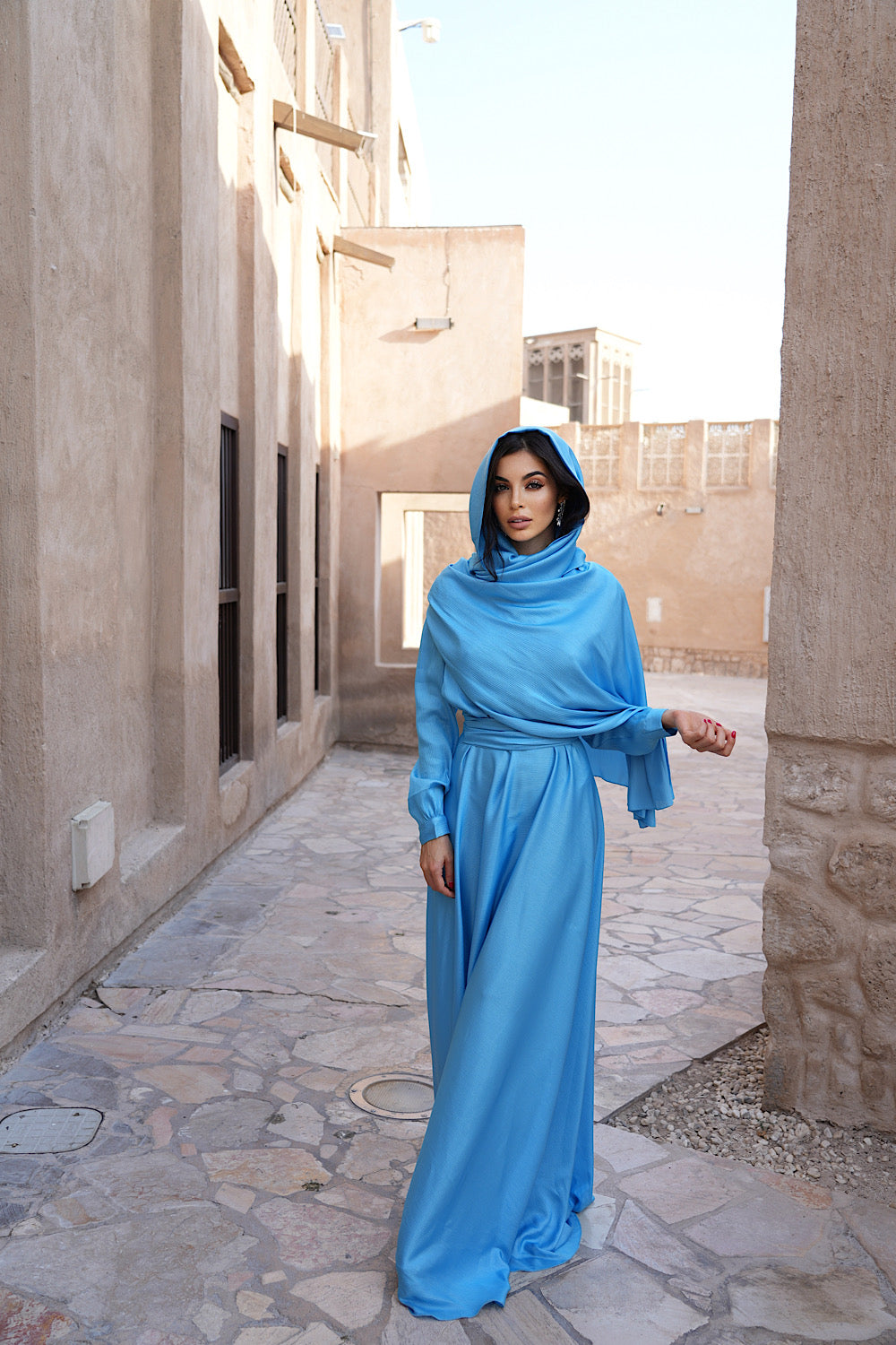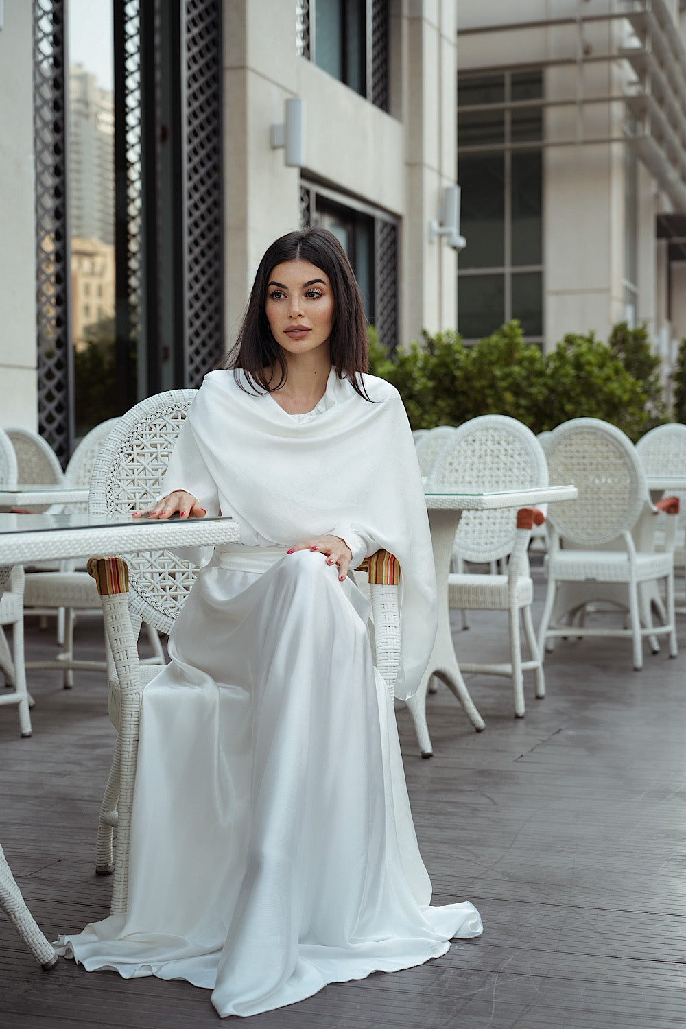 The head cover in matching colour is not part of the dress. It is accessory for the photoshoot. Only the head cover is not part of the dress - not the drapery. If you want to order such head cover - write us on WhatsApp. Price 40AED