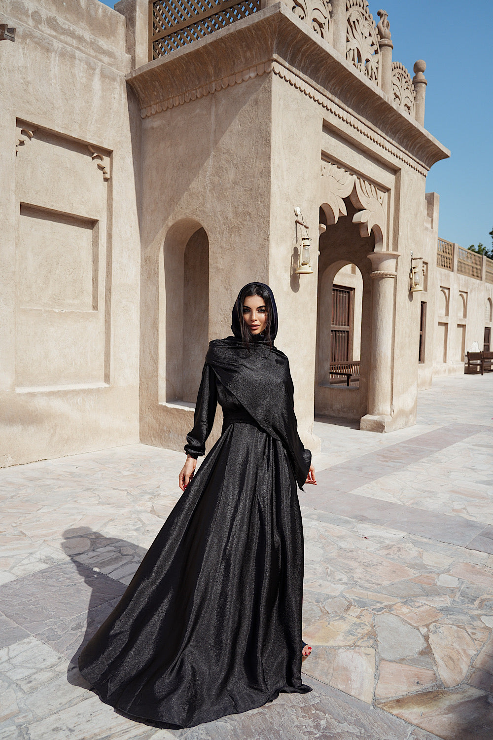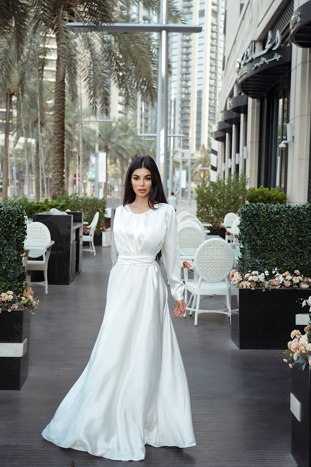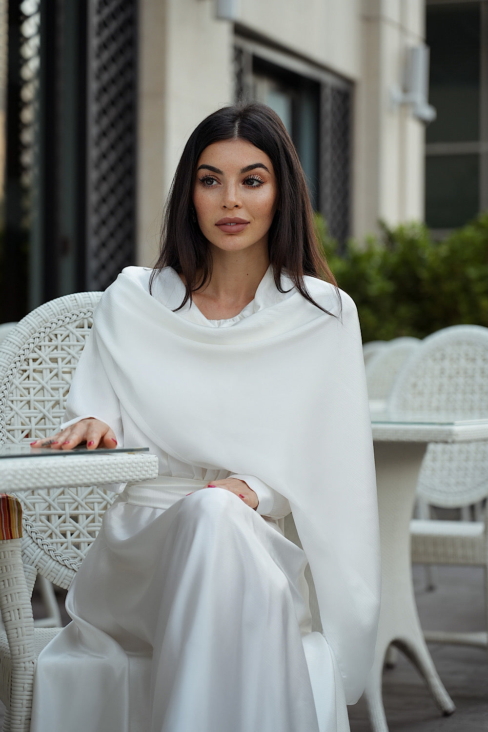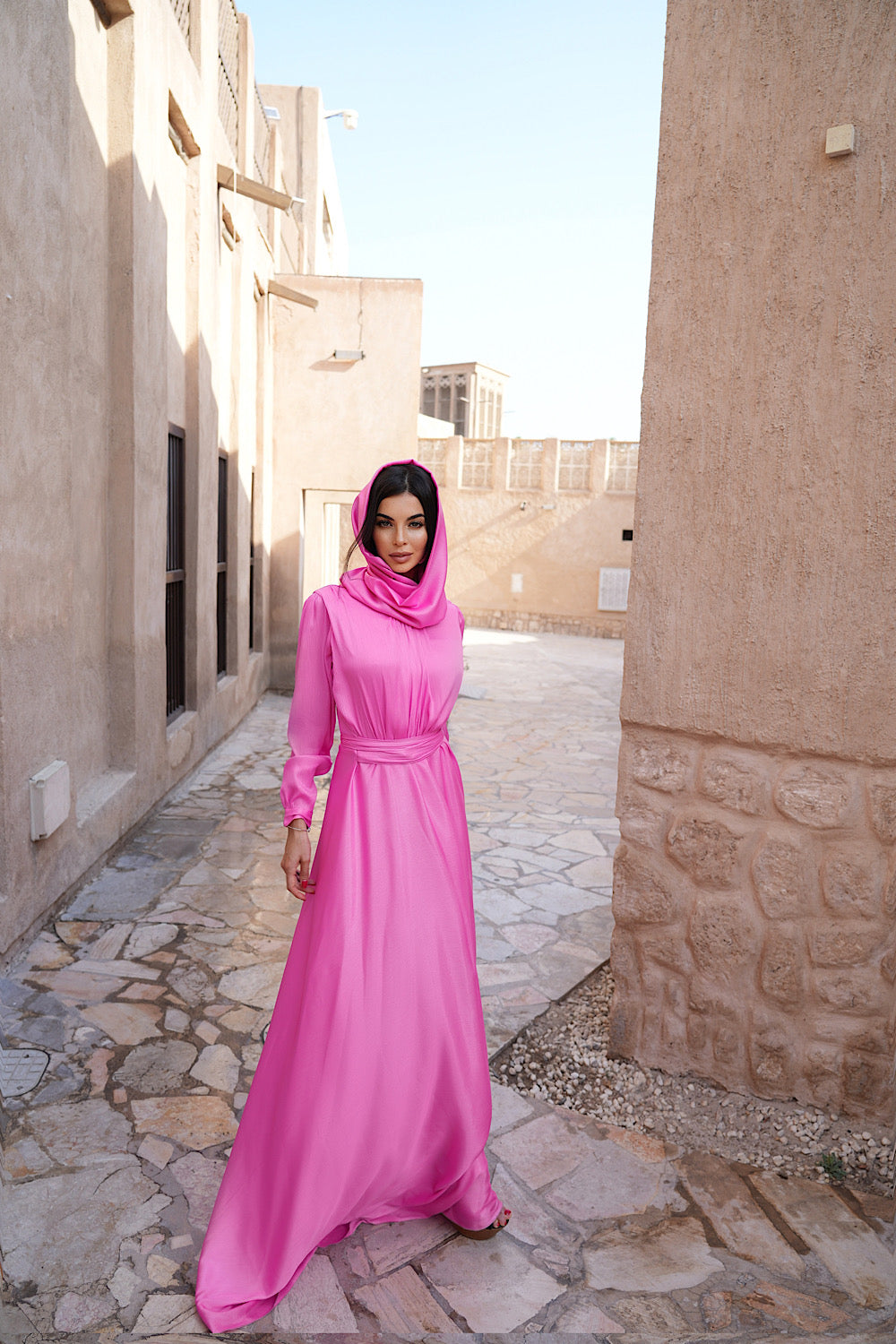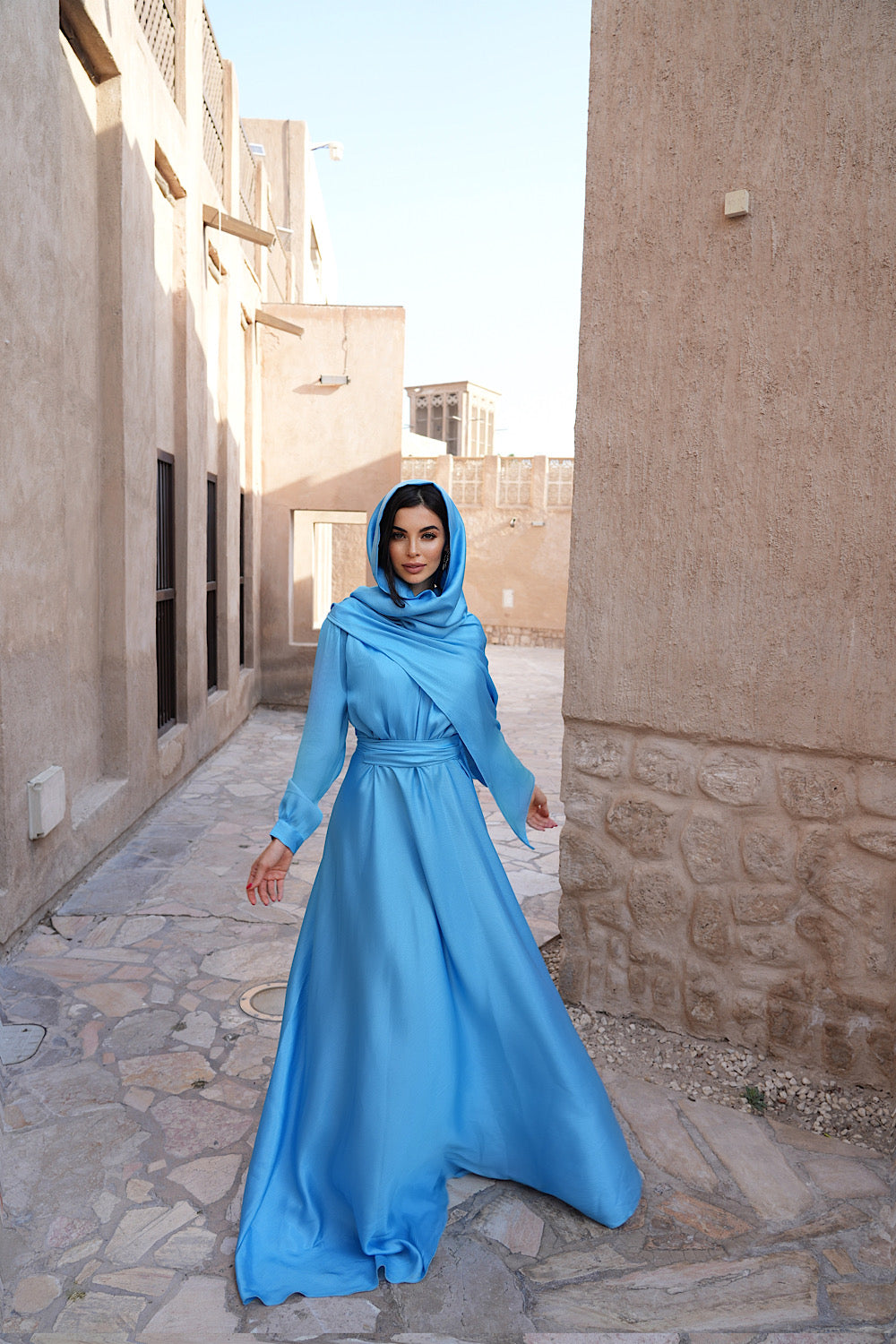The head cover in matching colour is not part of the dress. It is accessory for the photoshoot. Only the head cover is not part of the dress - not the drapery. If you want to order such head cover - write us on WhatsApp. Price 40AED