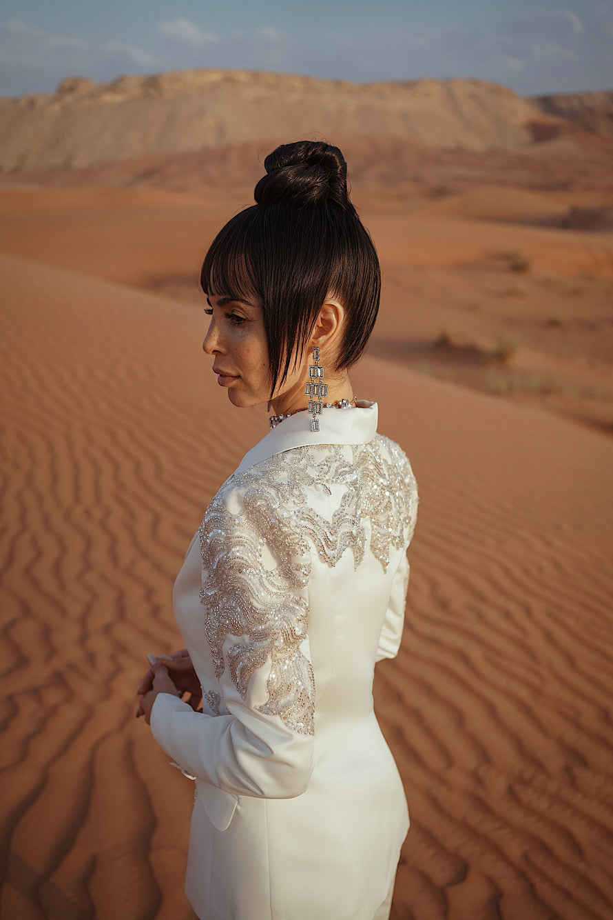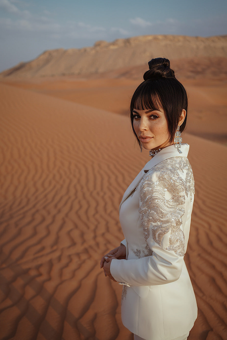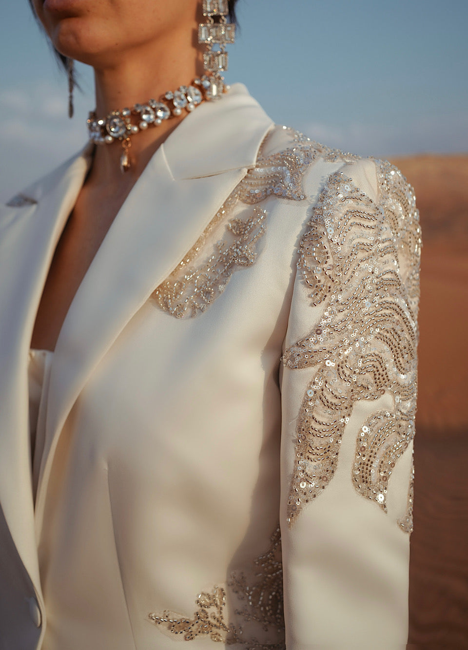 Shoulder Beaded Sequins Blazer Cream/White